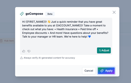 You can accept the goCompose message by clicking "Apply" or refine the message by clicking "Adjust".