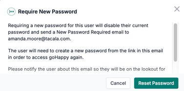 6. In the modal that appears, click "Reset Password". Then an email will be sent from support@gohappyhub.com to your employee.