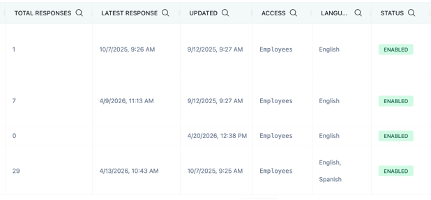 After navigating to the keywords page, Admins will see a list of all created keywords, the total number of responses for each keyword, date of last submitted response, the contact group that can access the keyword and if the keyword is enabled or not.
