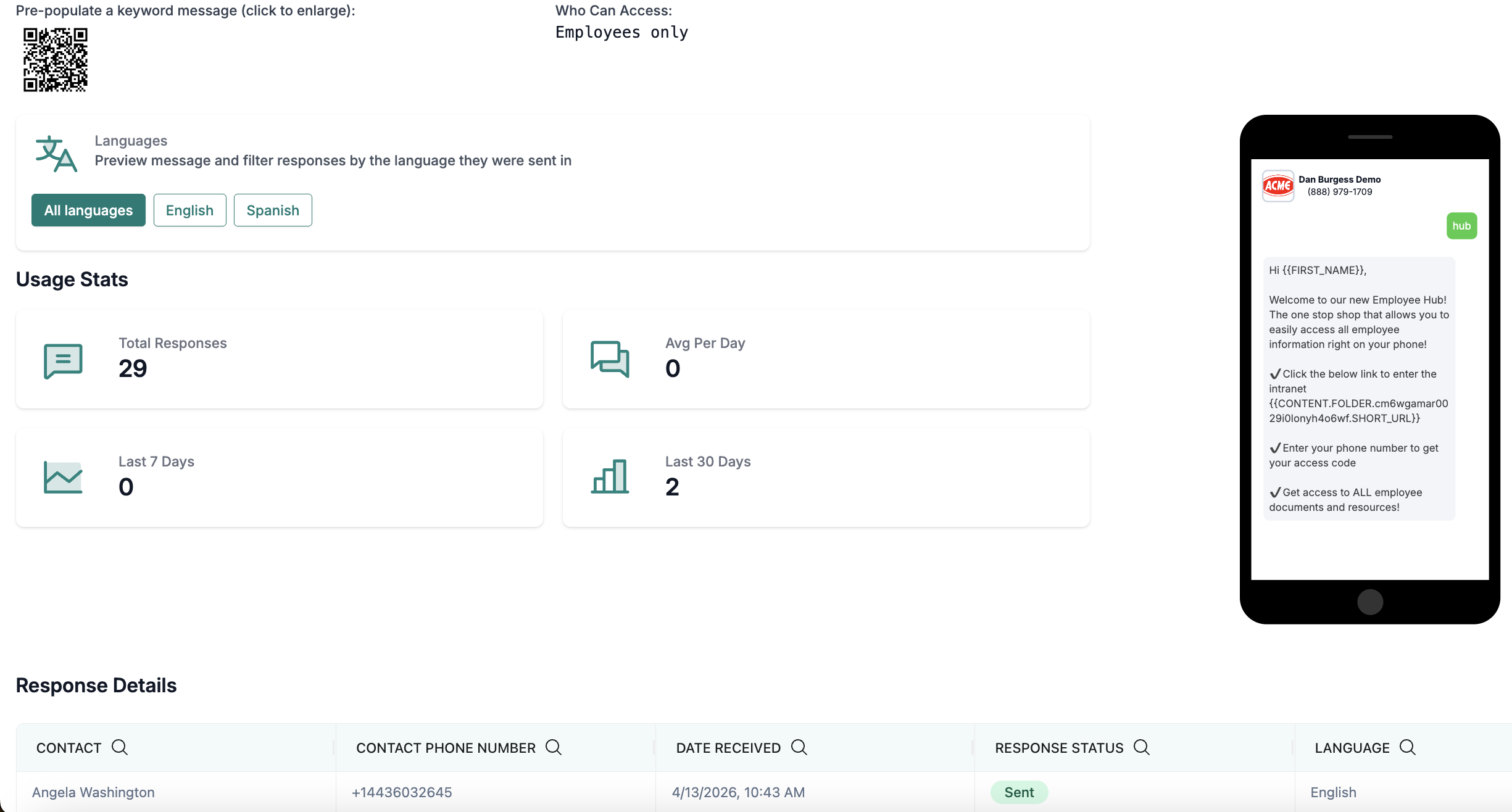 Admins will see more details around performance, like the average usage per day, or trend performance. Further down the page, Admins will also be able to see who responded to a keyword and when. This data is also helpful if an employee has cell service issues, so they can text a keyword to ensure they are receiving texts and Admins can see their name listed on the page.