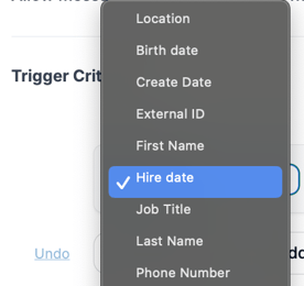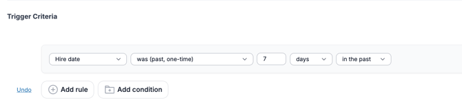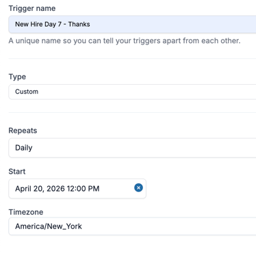 In this example, we'll be sending out a trigger one week after someone's hire date.