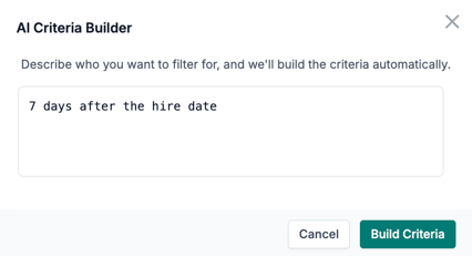 Click the AI Criteria Builder button and enter the logic you want the builder to follow, like "7 days after hire date"